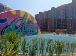 Придомовая территория с ландшафтным дизайном разделена на безопасные детские площадки с тренажерами, зонами воркаута с тренажерами и турниками, баскетбольная арт- площадка и местами для отдыха.