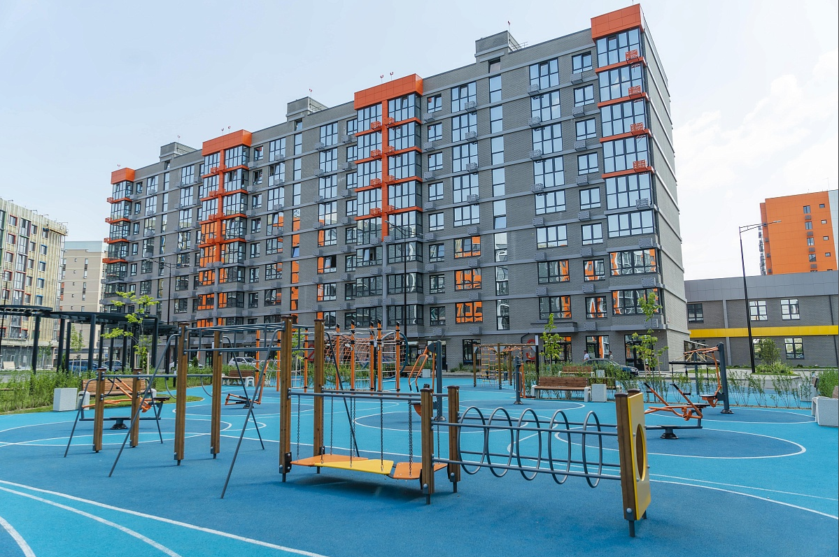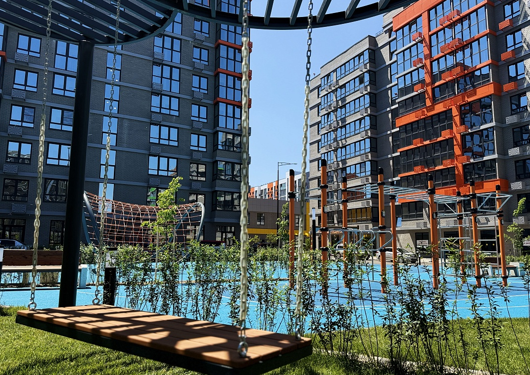 Придомовая территория с ландшафтным дизайном разделена на безопасные детские площадки с тренажерами, зонами воркаута с тренажерами и турниками, баскетбольная арт- площадка и местами для отдыха.