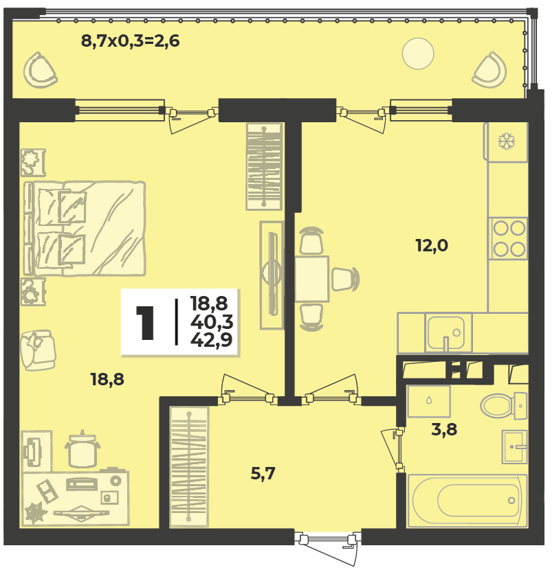 Продается однокомнатная новостройка, 42.9 кв.м., 4/9 эт