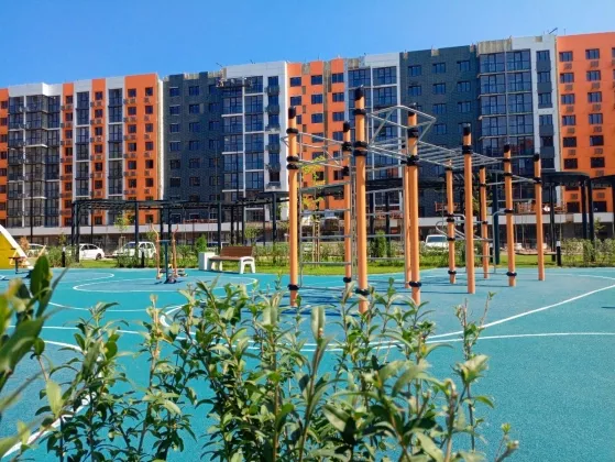 Придомовая территория с ландшафтным дизайном разделена на безопасные детские площадки, зонами воркаута с тренажерами и турниками, баскетбольная арт- площадка и местами для отдыха.