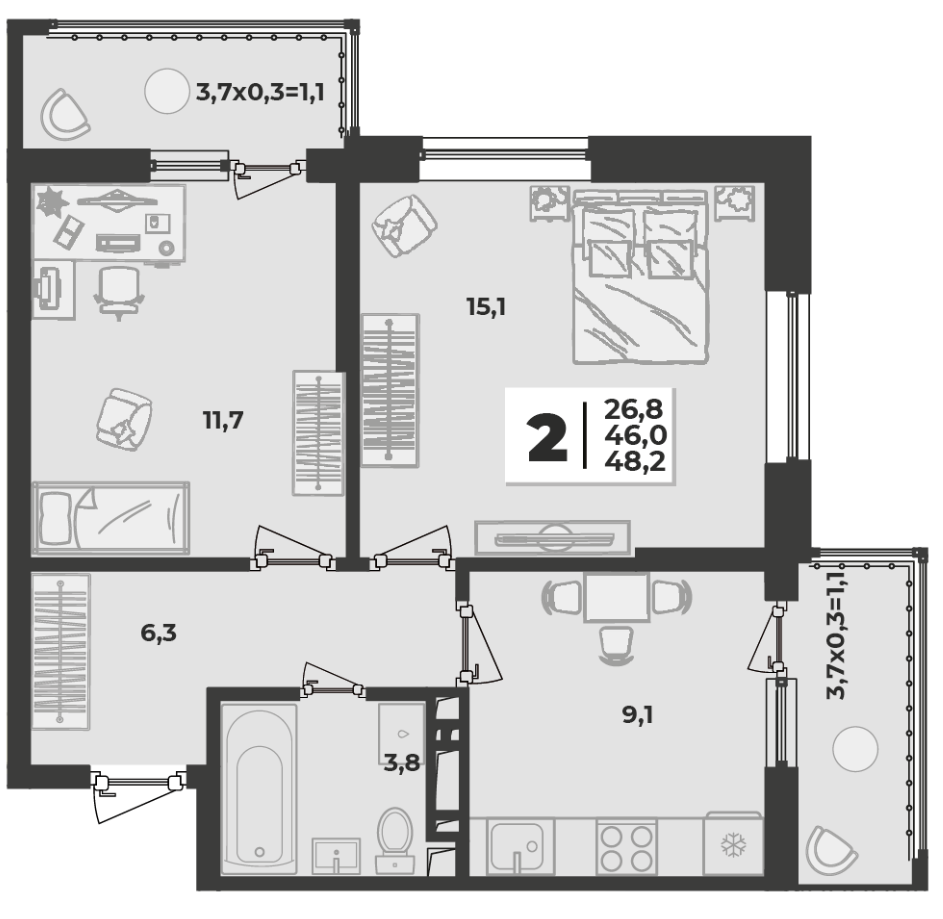 Продается 2-х комн. новостройка, 48.2 кв.м., 3/9 эт