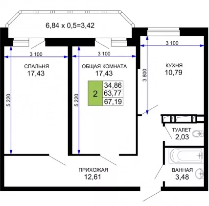 Продается 2-х комн. новостройка, 68.48 кв.м., 10/19 эт