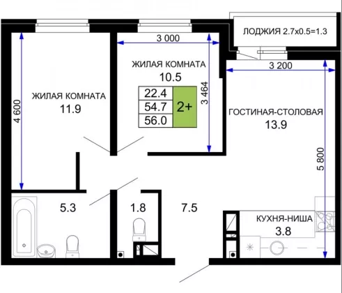 Продается 2-х комн. новостройка, 56 кв.м., 16/16 эт