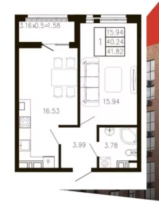 Продается однокомнатная новостройка, 41.82 кв.м., 3/9 эт