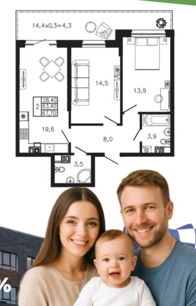 Продается 2-х комн. новостройка, 67.7 кв.м., 1/4 эт