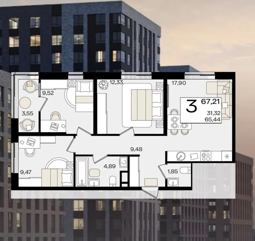 Продается 3-х комн. новостройка, 67.21 кв.м., 3/18 эт