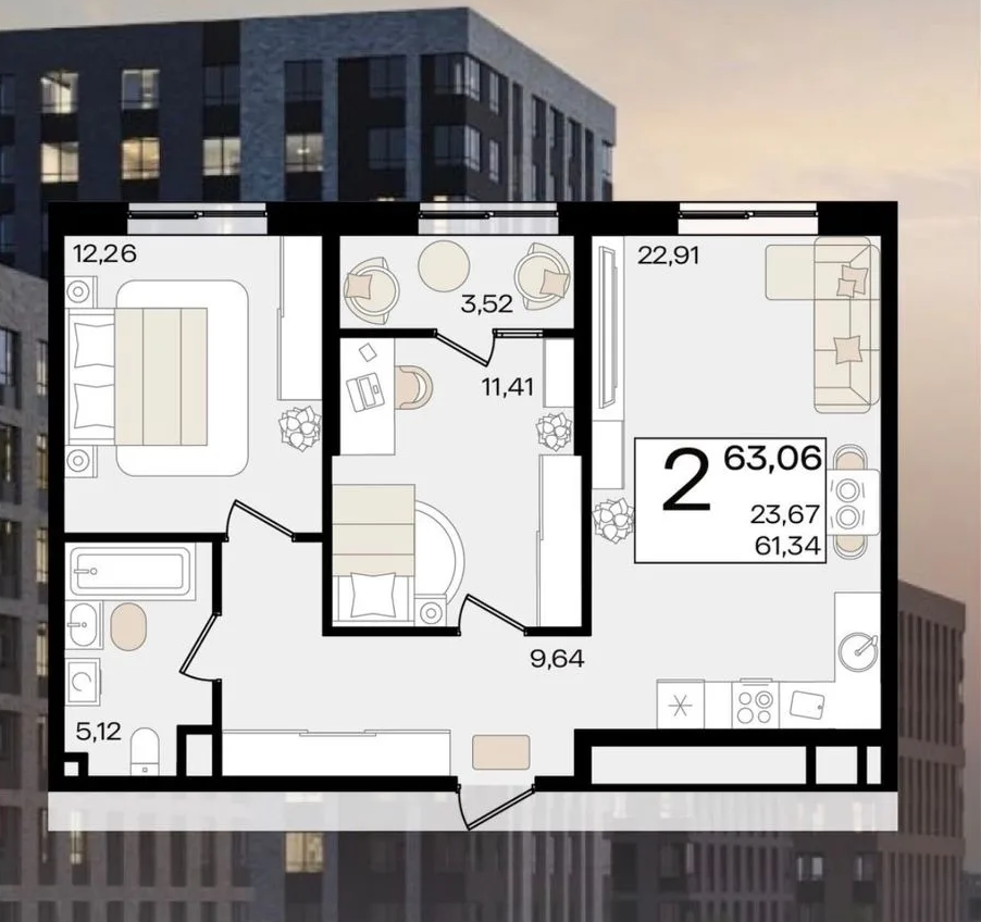 Продается 2-х комн. новостройка, 63.06 кв.м., 3/20 эт