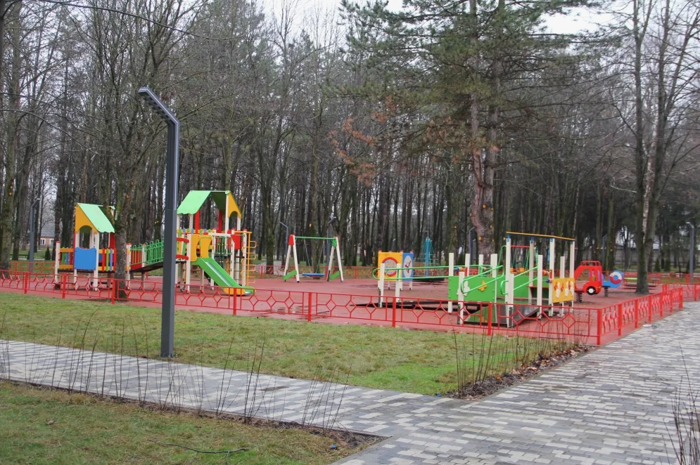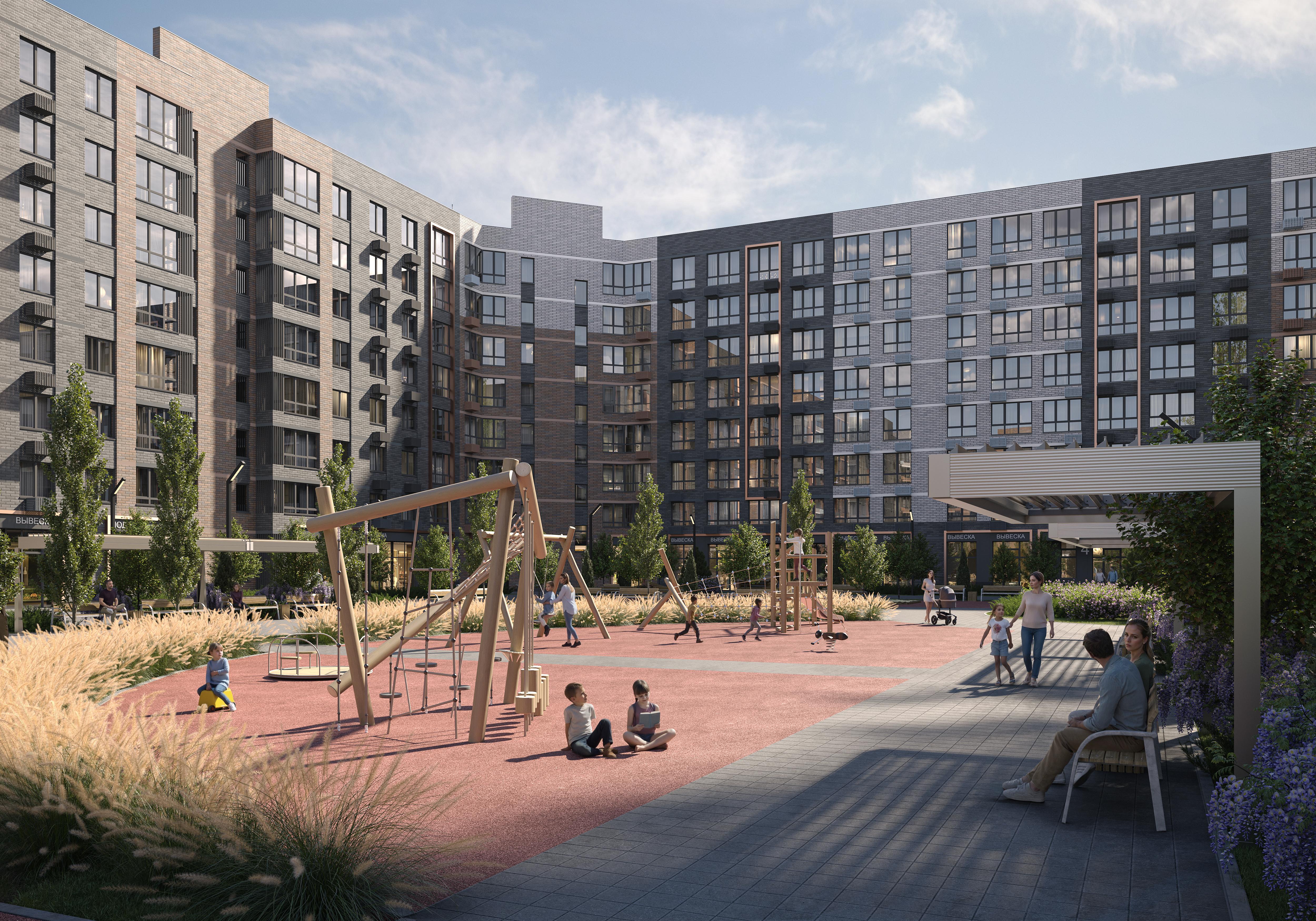 Собственный сквер, детские игровые площадки с безопасным покрытием, велодорожки 796 метров, городской парк «Сосновый».