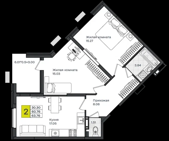 Двухкомнатная квартира с просторной кухней- гостиной 17,05 м2!!!