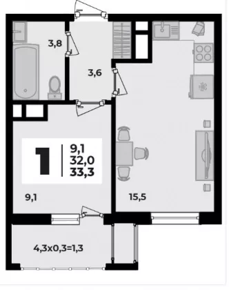 Продается однокомнатная новостройка, 33.9 кв.м., 4/9 эт