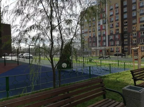 Большое расстояние между домами, много места для парковки автомобилей. Двор с красочными детскими и спортивными площадками , скамейками для отдыха и зелеными кустарниками и деревьями. Здесь хочется жить приезжайте и убедитесь сами.