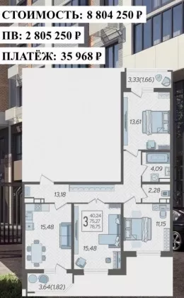 Продается 3-х комн. новостройка, 78.75 кв.м., 4/23 эт