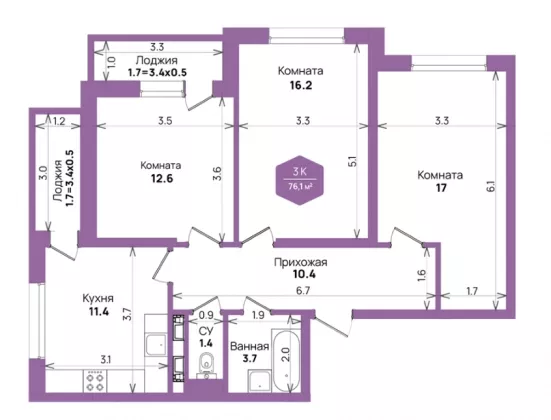 Продается 3-х комн. новостройка, 76.1 кв.м., 1/17 эт