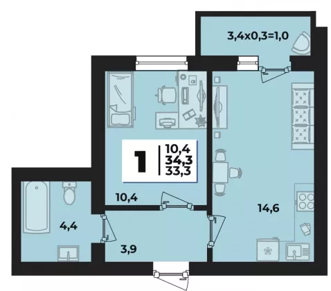Продается однокомнатная новостройка, 34.3 кв.м., 1/5 эт