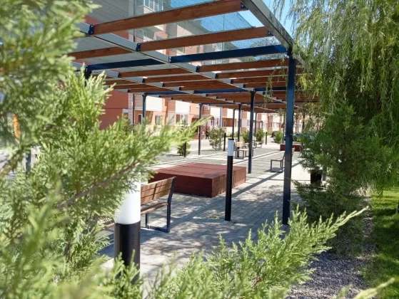 В жилом комплексе своя особая внутренняя среда, уютные зеленые дворы со скамейками, игровые и спортивные площадки, озеро с благоустроенной набережной, семейный сквер.
