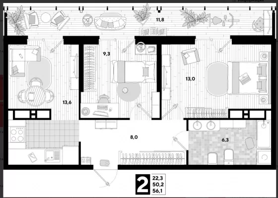Продается 2-х комн. новостройка, 56.1 кв.м., 12/16 эт