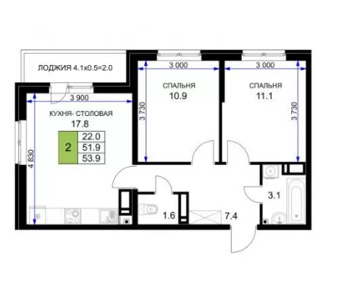 | Площадь, кв.м. | 53.3 |