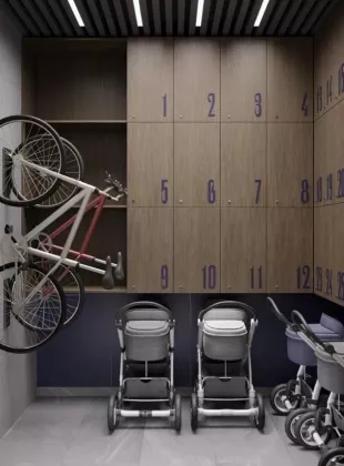 На доме смонтированы боксы под внешний блок сплит системы, смонтирована дренажная система по выводу конденсата от сплит систем. Подъезды красочно оформлены, есть место под коляски и велосипеды. Сквозные подъезды, дом без машин.
