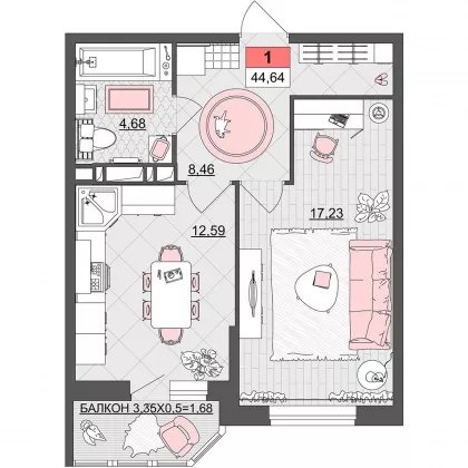 Продается однокомнатная новостройка, 44.64 кв.м., 12/19 эт