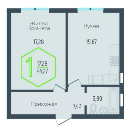 Продается однокомнатная новостройка, 44.27 кв.м., 2/3 эт