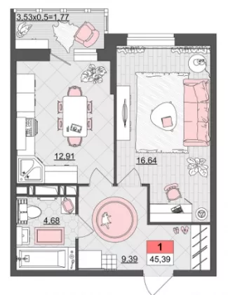 Продается однокомнатная новостройка, 45.39 кв.м., 14/19 эт