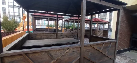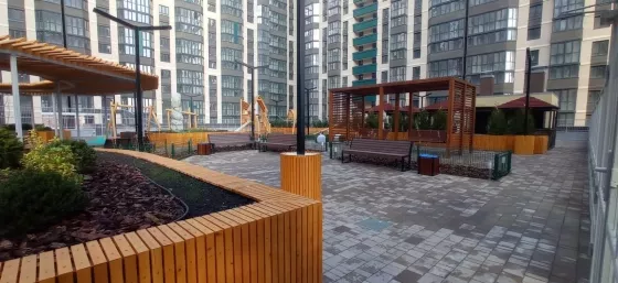 Шикарная придомовая территория, есть стилобат, паркинг для авто, мангальная зона, беседки, двор с ландшафтным озеленением
