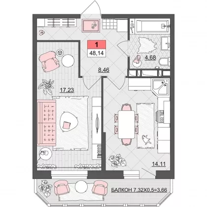 Продается однокомнатная новостройка, 48 кв.м., 8/24 эт