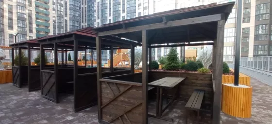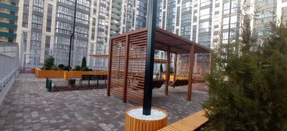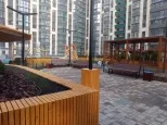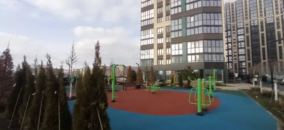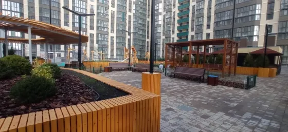 Шикарная придомовая территория-стилобаты с современными безопасными детскими площадками , баскетбольным и футбольным полем, зонами барбекю и беседками.