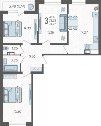 Продается 3-х комн. новостройка, 74.27 кв.м., 4/16 эт