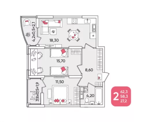 | Площадь, кв.м. | 62.3 |