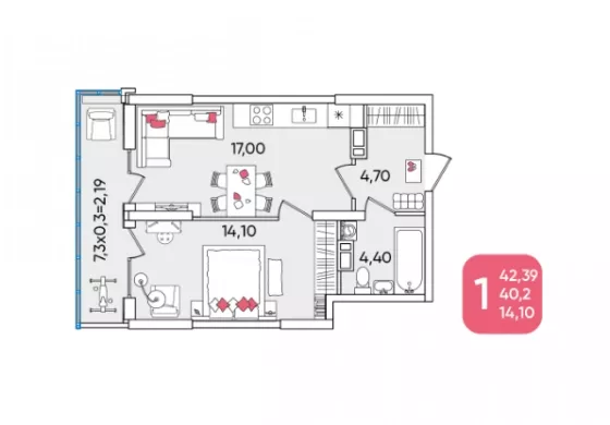 Продается однокомнатная новостройка, 42.3 кв.м., 9/24 эт