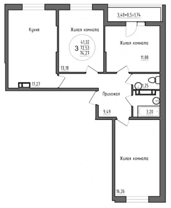 Продается 3-х комн. новостройка, 74.27 кв.м., 12/16 эт