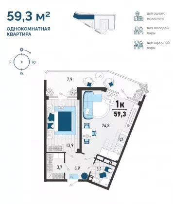 Планировка с ленточной лоджией, большой кухней-гостиной и гордеробной!