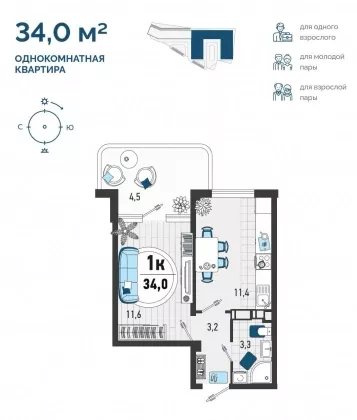 Продается однокомнатная новостройка, 34 кв.м., 1/3 эт
