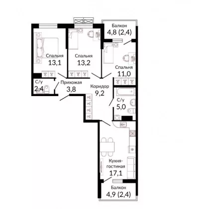 В квартире улучшенная планировка, просторная кухня-гостинная, комнаты правильной формы, два сан.узла, две лоджии.