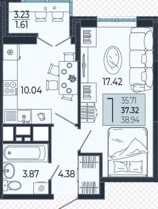Продается однокомнатная новостройка, 39.38 кв.м., 14/21 эт