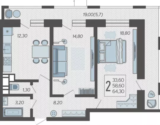 Продается 2-х комн. новостройка, 64.7 кв.м., 9/12 эт