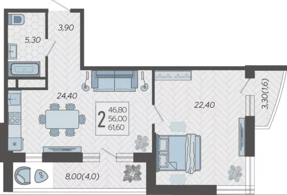 Продается 2-х комн. новостройка, 61.6 кв.м., 11/16 эт