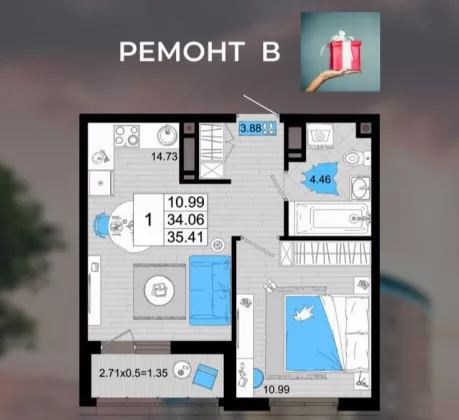 Продается однокомнатная новостройка, 36 кв.м., 11/18 эт