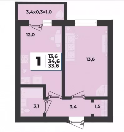 Продается однокомнатная новостройка, 34.6 кв.м., 2/5 эт