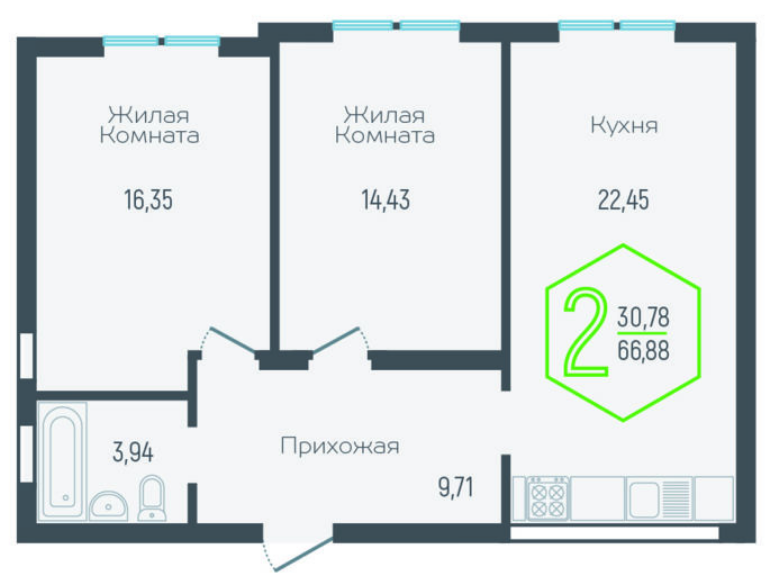 Продается 2-х комн. новостройка, 66.88 кв.м., 3/3 эт