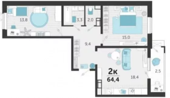 Двухкомнатная квартира с большой кухней и светлыми комнатами.