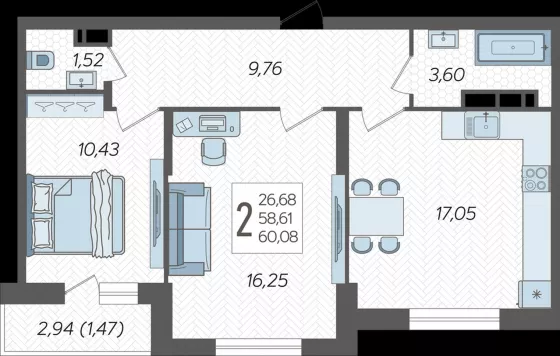 Продается 2-х комн. новостройка, 60.08 кв.м., 5/19 эт