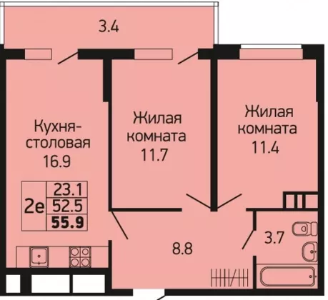 Продается 2-х комн. новостройка, 55.9 кв.м., 8/24 эт