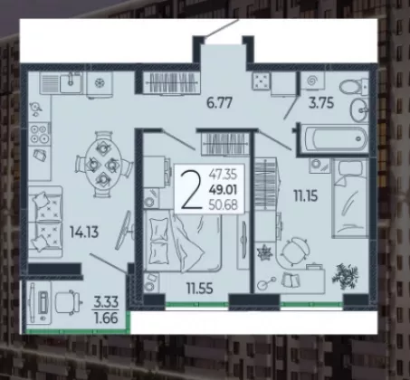 Продается 2-х комн. новостройка, 50.68 кв.м., 14/21 эт