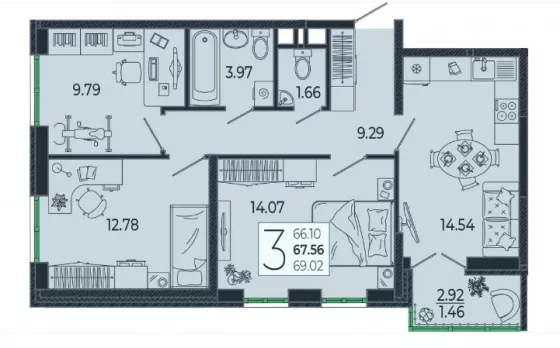 Продается 3-х комн. новостройка, 69.02 кв.м., 15/21 эт