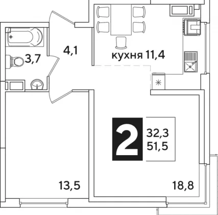 Продается 2-х комн. новостройка, 51.5 кв.м., 8/16 эт