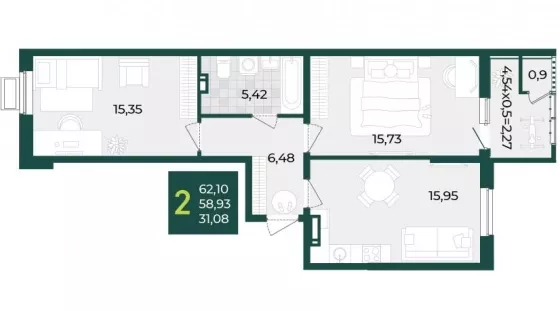 Продается 2-х комн. новостройка, 62.1 кв.м., 10/21 эт