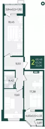 Продается 2-х комн. новостройка, 68.49 кв.м., 15/21 эт
