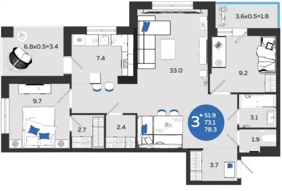 Просторная кухня, раздельные санузлы, два балкона. В спальни есть своя гардеробная, также в квартире есть отдельная комната (кладовка).